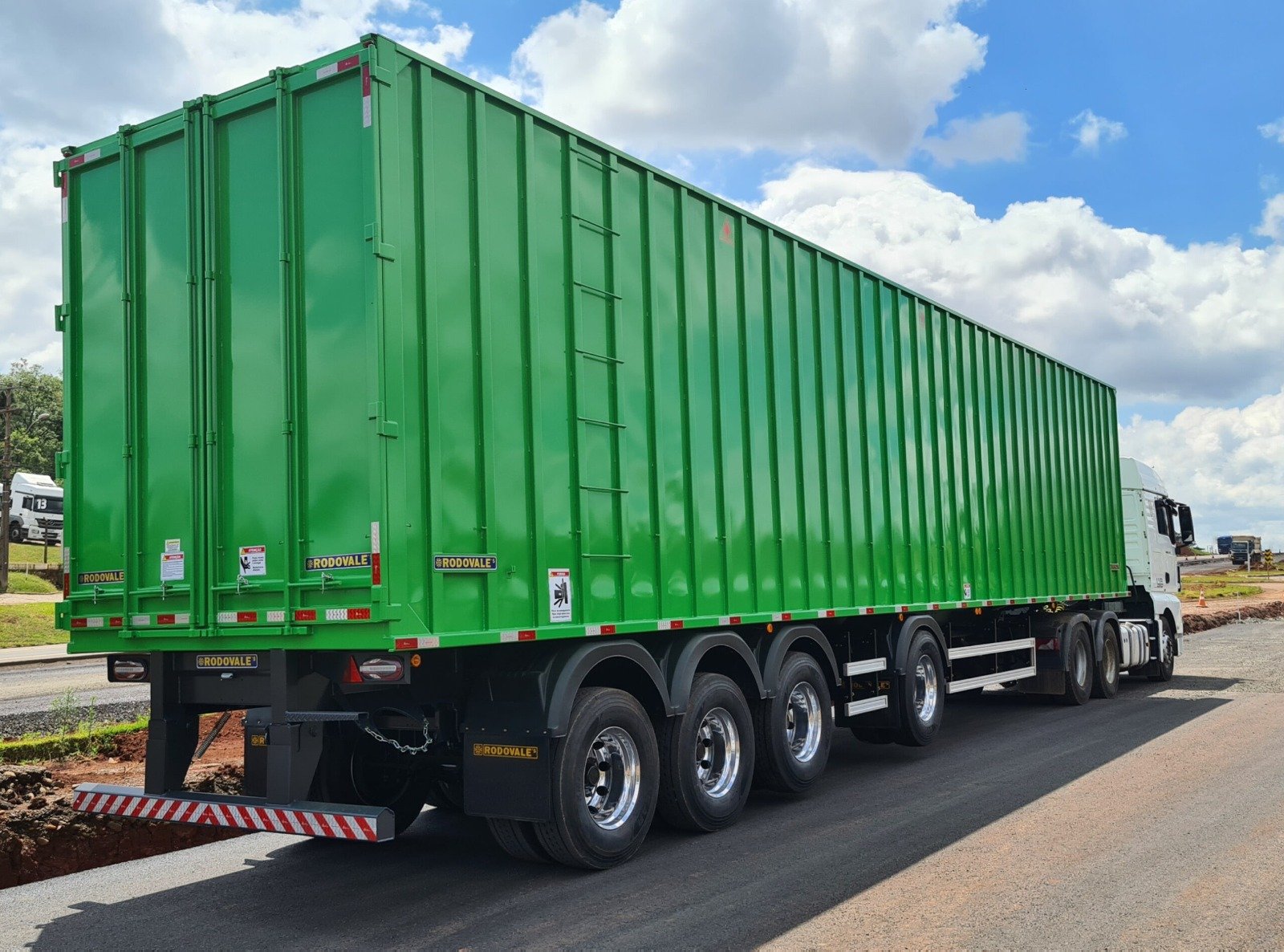 Semirreboque Cavaqueira, ideal para biomassa como cavaco de madeira, pó de serra, bagaço de cana e pellets, que usa um piso móvel hidráulico para descarga rápida e segura, sendo um implemento de alto desempenho para transporte de cargas leves e volumosas.